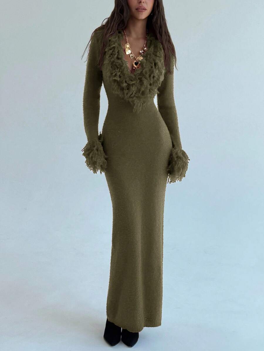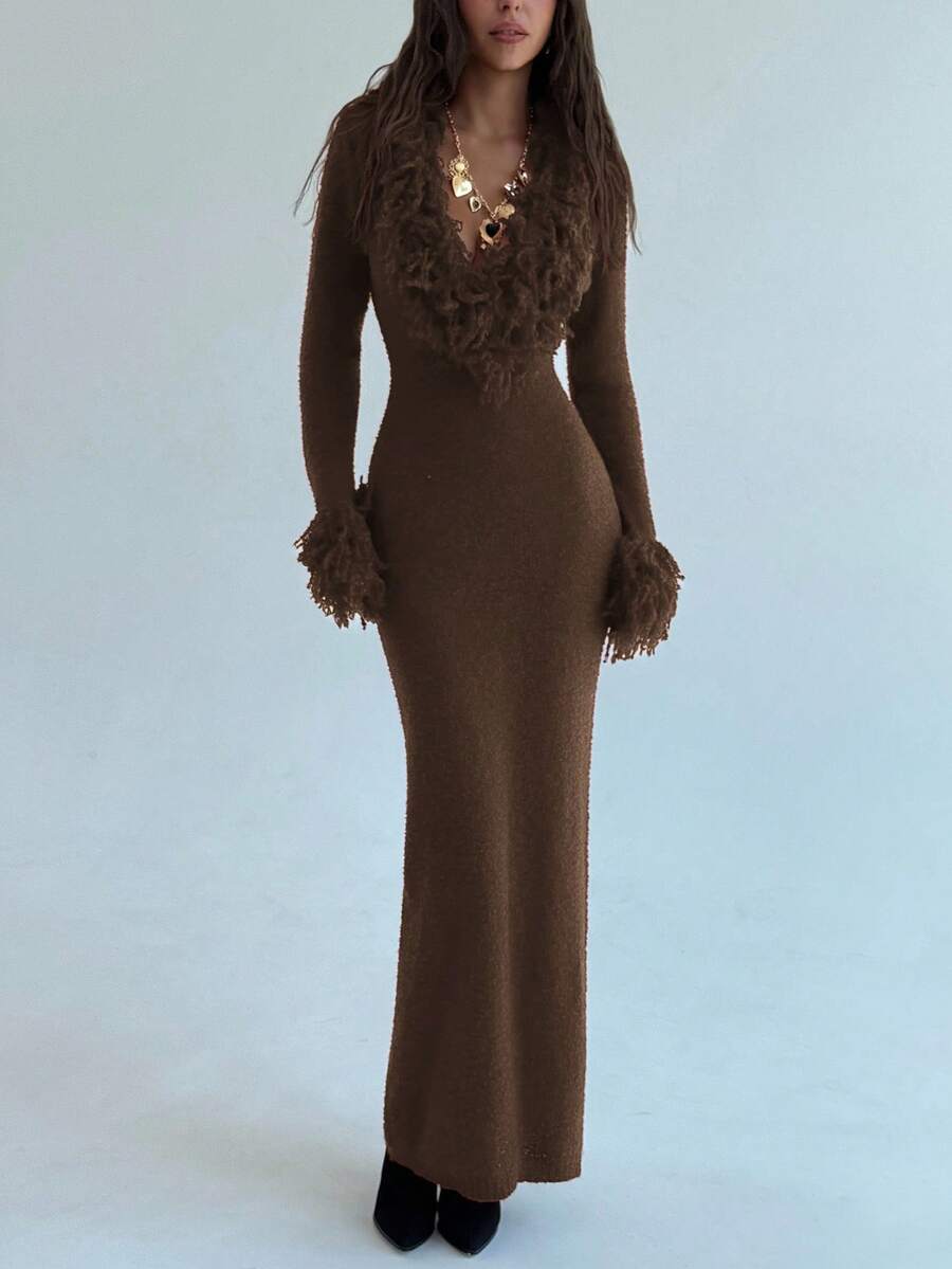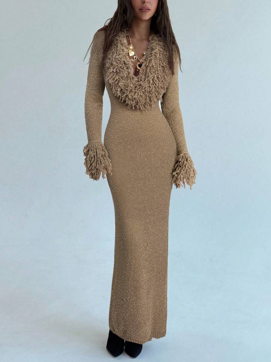 Aloruh V-Neck Fringed Fuzzy Patchwork Flared Hem Bodycon Maxi Knit Sweater Dress For Women In Fall/Winter,Christmas Sweater